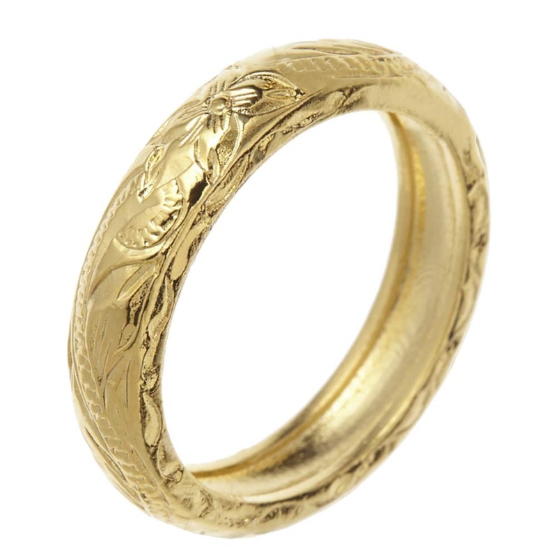 - This flat ring features a scroll pattern of Hawaiian jewelry inscribed on the top and sides of the ring