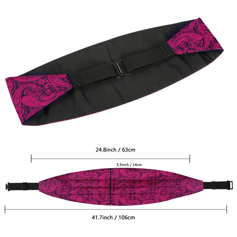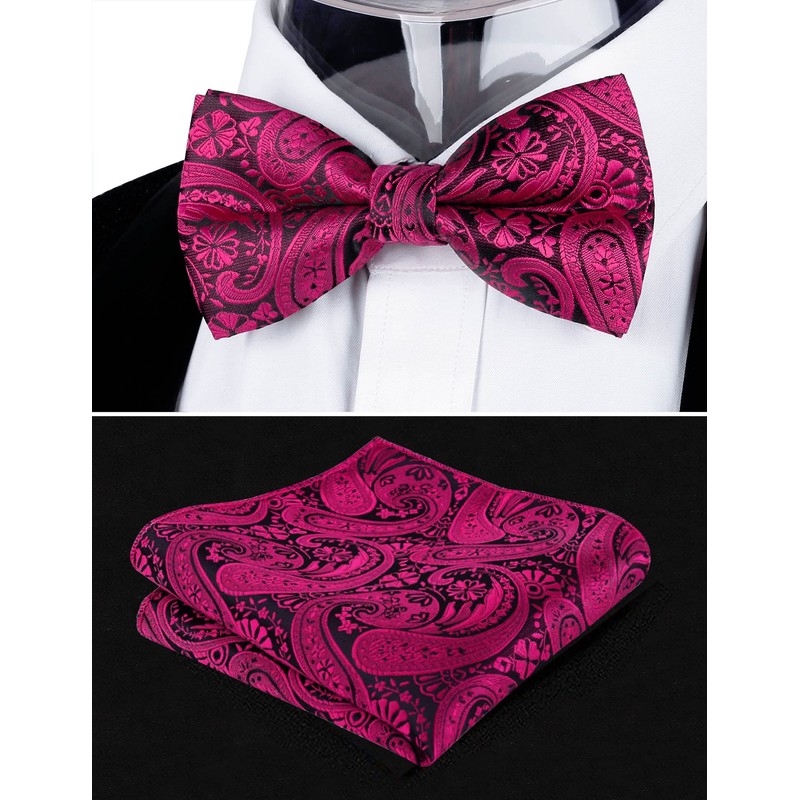 Alizeal Mens Classic Paisley Pre-tied Party Adjustable Bow Tie, Cummerbund and Pocket Square Set, Black+Hot Pink