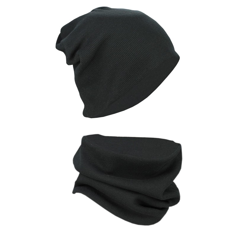 Alkato Unisex Beanie Hat and Scarf Set Plain, Black ribbed fabric