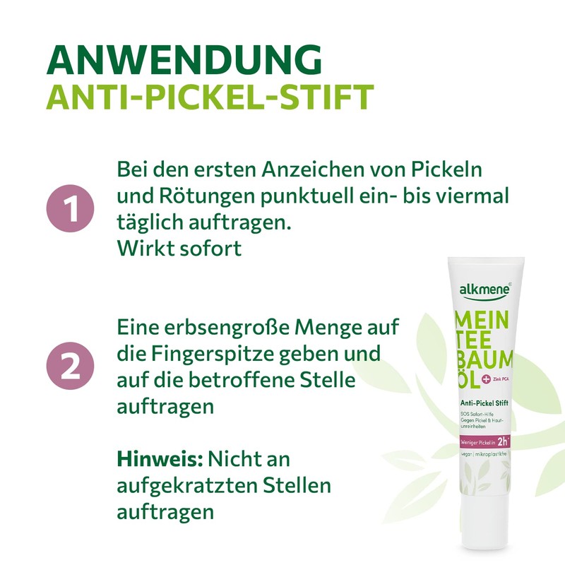 - Box contents: 2 x 15 ml alkmene anti-pimple pen with tea tree oil and zinc PCA - less pimples in 2 hours - non-comedogenic