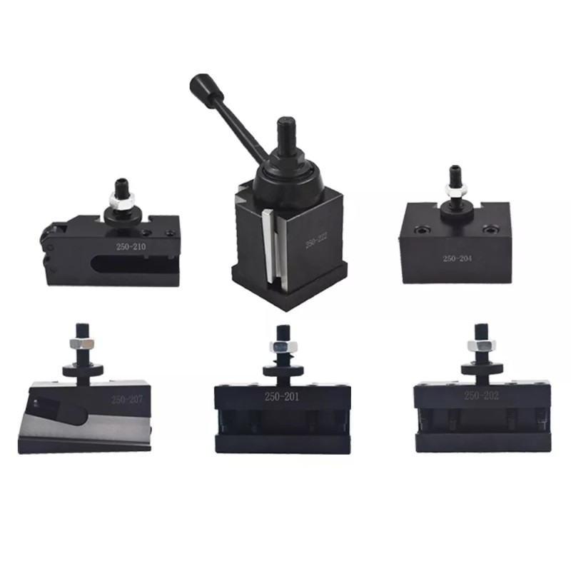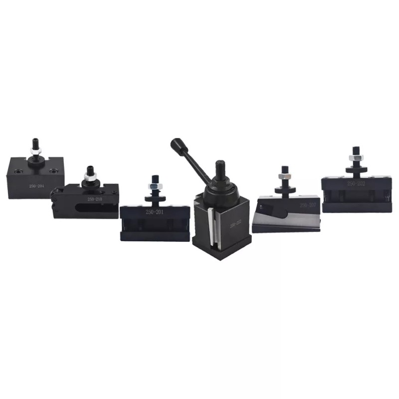 Whole set includes one each of: 251-222 Wedge Type Tool Post 250-201 Turning Tool Holder , use tool bit up to 5/8" 250-202 Boring,Turning Tool Holder, use tool bit up to 5/8" and round shank tool bits up to1/2" 250-204 Heavy Duty Boring Bar Holder, can use both 3/4 and 1" shank boring bars 250-207 Parting Blade Tool Holder, use 5/8" high parting blades 250-210 Knurling and Turning Tool Holder