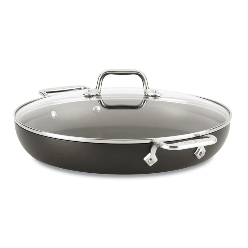 - Versatile All-Clad HA1 Hard Anodized Nonstick 12 inch everyday pan with lid, features a wide, flat base to accommodate bigger portions and flared, mid-sized sides that allow for easy flipping with minimal splattering.