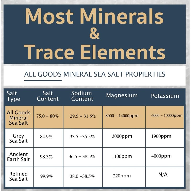- ✔️ VITAL MINERALS: All Goods baja mineral sea salt, sourced from fresh seawater, hand harvested, makes every meal a special occasion, features a comprehensive mineral & trace element profile for enhanced taste & improved vitality.