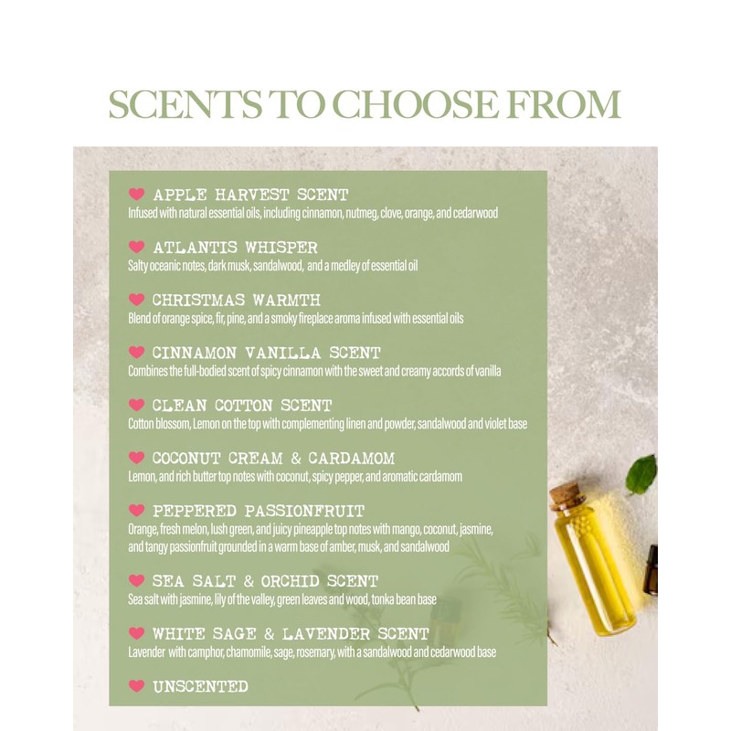 - ❤️ 100% natural Coconut Soy Wax in the USA (No Dyes) ❤️ Non-toxic (no lead, plastics, parabens, synthetic dyes, or phthalates) ❤️ 100% cotton wick (Lead and Zinc free) ❤️ Reusable glass jar ❤️ Compliant with ASTM safety standards ❤️ Burning time: 50-60 hours ❤️ 9 oz., 2.8″ × 3.5" (7.1cm × 8.9cm) ❤️ Nine different aromatic scents
