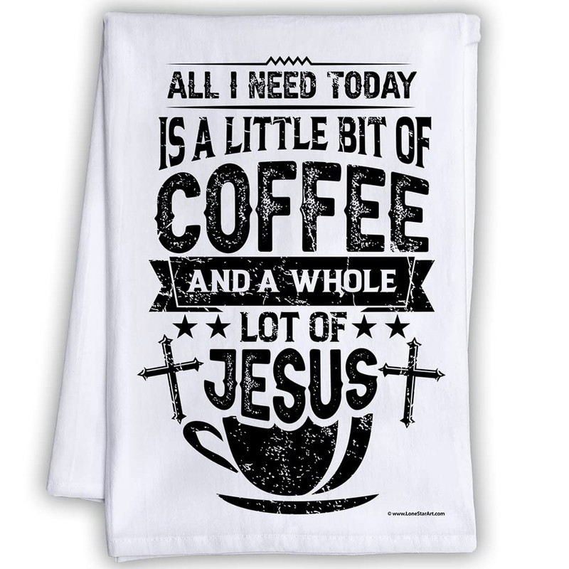 All I Need Today is a Little Bit of Coffee and a Whole Lot of Jesus -Funny Towels for, Coffee Lovers Dish Baking Hand Towel, Housewarming Gifts, Flour Sack Multi-Use 100% Cotton, Black and White 29x28