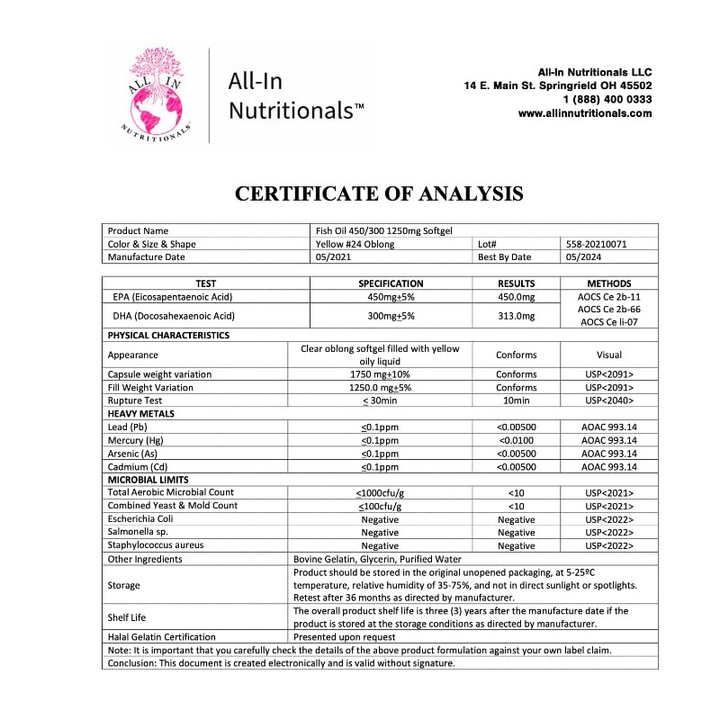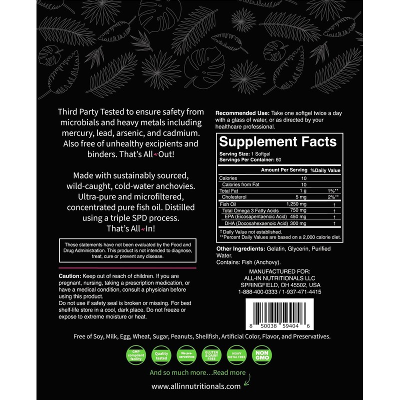 WHAT MAKES OUR TOTAL OMEGA PLUS STAND OUT? Our clean formula and our pure ingredients. Just read our label. All-In Total Omega Plus is a potent product made with naturally-sourced ingredients including sustainably sourced, wild-caught, cold-water anchovies. Every single batch comes with a certification of analysis showing that our fish oil is free from mercury, lead, cadmium, and arsenic. All-In’s Total Omega also features: A soft gel rapid delivery system: oil/liquid in a soft gel = 30min breakdown/disbursement guaranteed Our raw materials are ultra-pure, microfiltered and concentrated No unappealing aftertaste Manufactured at a cGMP certified and FDA registered facility Third party tested to ensure safety from microbials and heavy metals including mercury, lead, arsenic, and cadmium. Our All-In Total Omega Plus is easy to take, flavorless, quickly absorbed and assimilated and as pure and clean as they come! This simple, yet masterfully formulated product contains strong and potent amounts of DHA, EPA, and Omega 3 fatty acids, designed for maximum effect and absorption. *