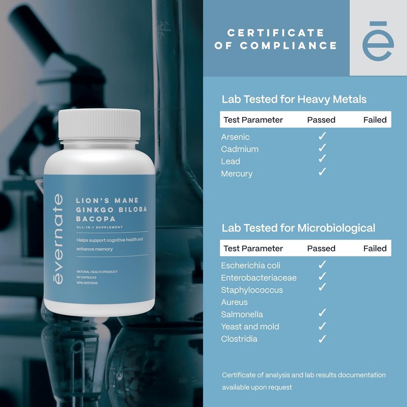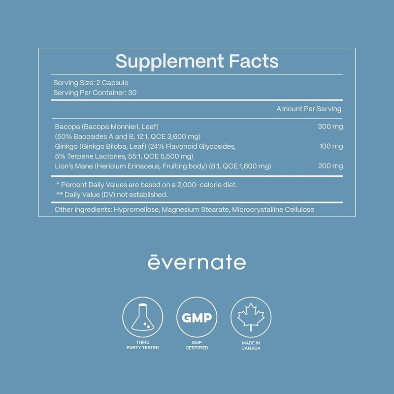 - ALL-IN-ONE BRAIN SUPPORT FORMULA Evernate combines the powerful benefits of Lion's Mane, Ginkgo Biloba, and Bacopa Monnieri in a single supplement to support memory, focus, and cognitive performance—perfect for those seeking an all-in-one brain health solution.