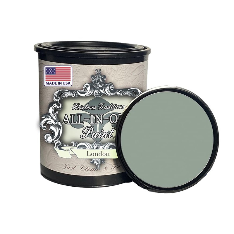 ALL-IN-ONE Paint, London (Green Gray), 32 Fl Oz Quart. Durable cabinet and furniture paint. Built in primer and top coat, no sanding needed.