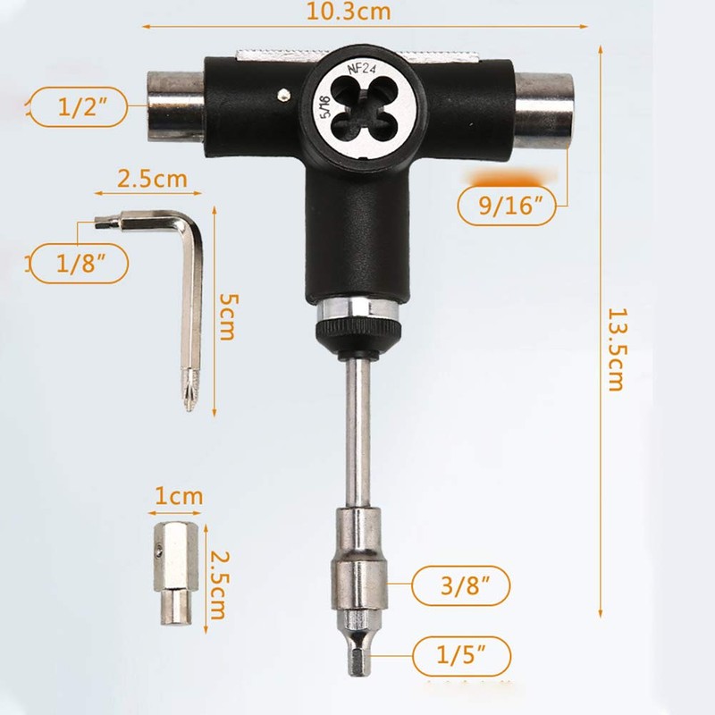 - ☆ The all-in-one skate tool has everything you need to tighten or repair your skateboard. This skate tool works with all types of skateboards and longboards, it can help change wheels, clean your bearing.
