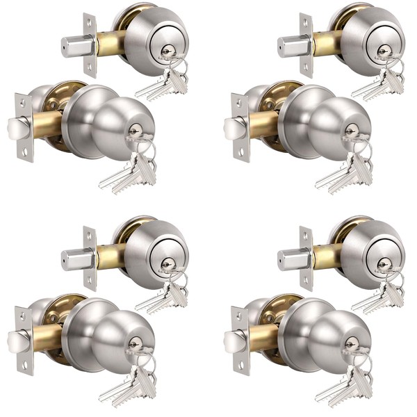 Knobonly Entry Door Knobs and Double Cylinder Deadbolt, Keyed Alike Door Handle Set with Same Keys, Combo Pack for Front Doors-Keyed on Both Side, Satin Nickel Finish, Contractor Pack of 4 Set