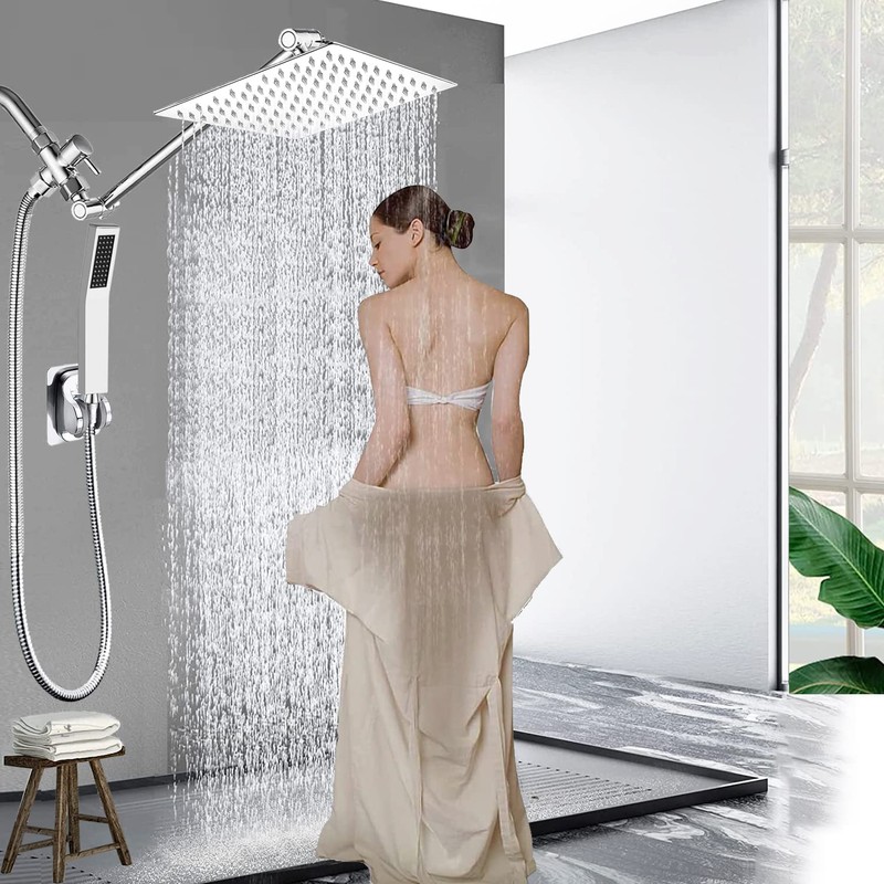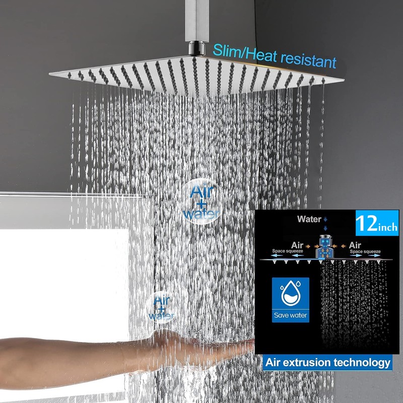 - 🛀 Large Square Rainfall Shower Head :- 12'' Square shower head made from 304# stainless steel and 196 self-cleaning silicone nozzles for superior water flow coverage. Soft silicone jets prevent lime scale build-up for maintenance-free enjoyment, resistant to clogging, easy to clean, anti-oxidation and corrosion resistant. It comes with leak-proof connection and angle-adjustable tough ball joint nut for satisfying different position shower needs. Will give you a excellent shower experience.