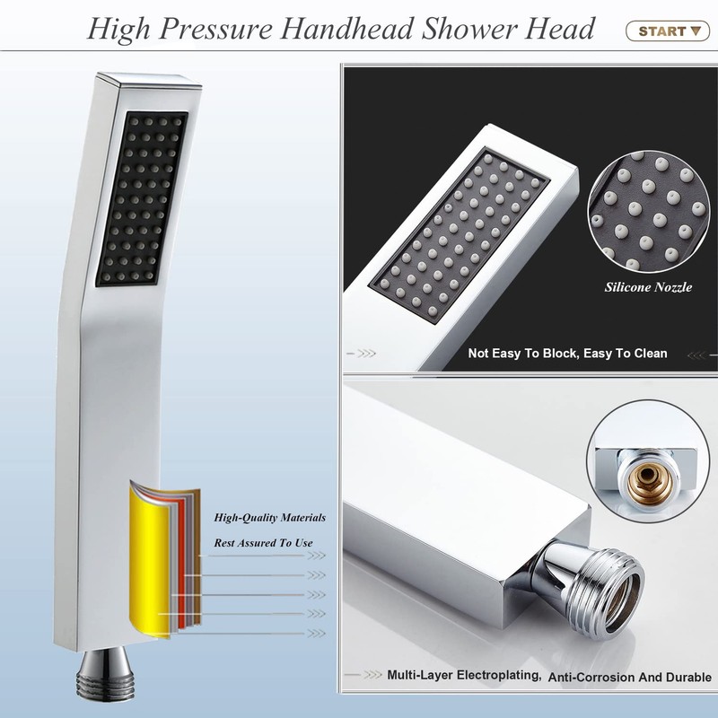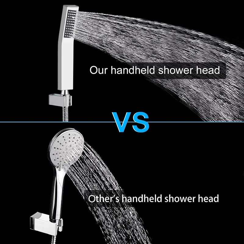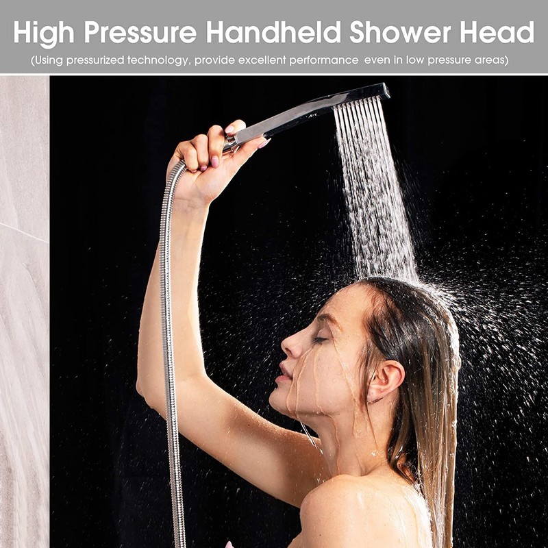 - 🛀 Brass 3-Way Diverter :- The diverter convert water from rainfall shower head and handheld conveniently. Two shower head can use together (water pressure is HALVED). The extendable handheld shower head comes with a 78” inch hose, almost 18 inches longer than most competitors. The hose is easy to install, and features an anti-tangle design.(Notice: This diverter has NO FUNCTION OF SHUTTING OF THE WATER).