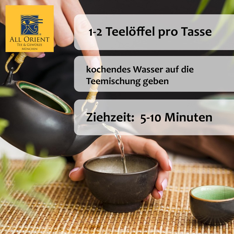 • EINFACHE ZUBEREITUNG: Nehmen Sie 1-2 gehäufte Teelöffel Tee pro Tasse und geben sie sprudelnd kochendes Wasser auf die Teemischung. Anschließend 5-10 Minuten ziehen lassen und schon können Sie Ihren Tee genießen.