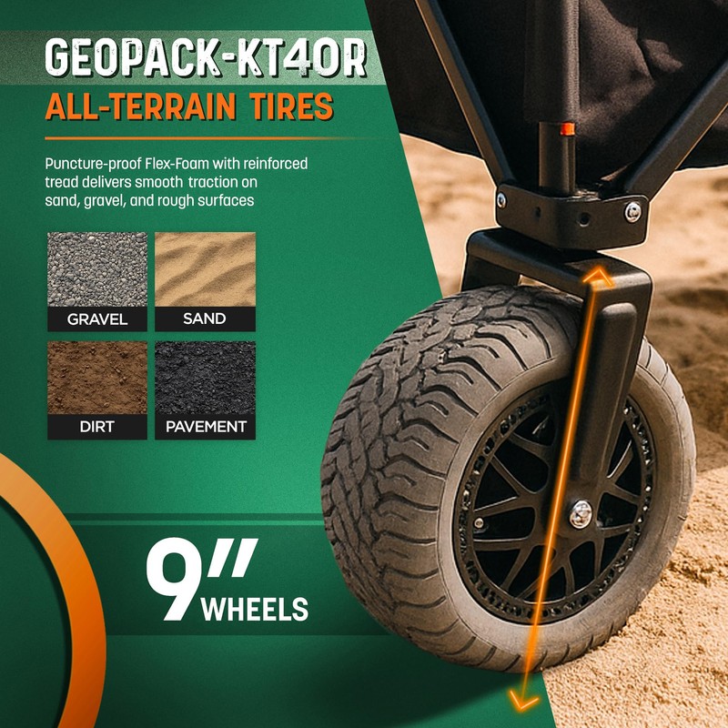 9x5” Solid Wheels for All Surfaces: Extra-wide GeoPack-KT40R airless treaded tires are molded from puncture-proof Flex-Foam and finished with reinforced PU tread, providing smooth traction over sand, gravel, and uneven ground without ever needing air or maintenance.