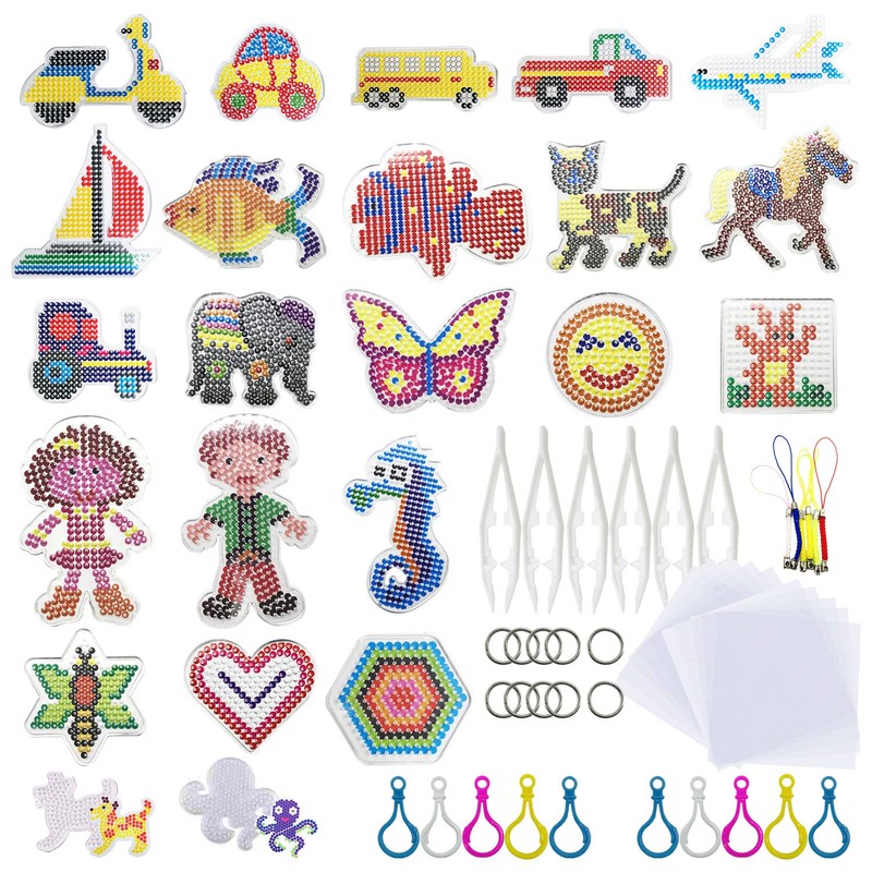 - Rich fuse beads boards set: 23 PCS mix shape fuse beads boards and each one has a colorful paper card for you to follow, 6 PCS white beads tweezers, 10 PCS ironing paper, 10 PCS plastic colorful keychain and 5 PCS colorful polyester lanyard.