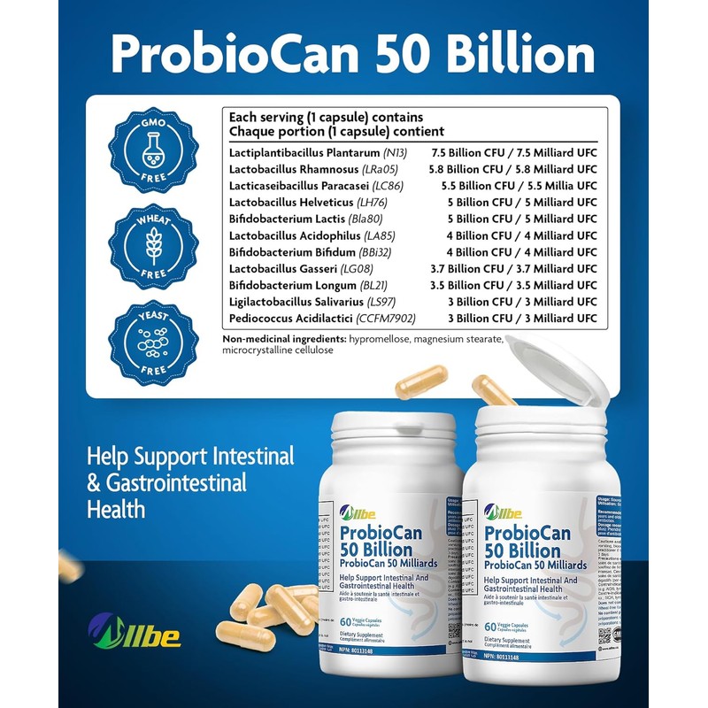 - REBUILDING GUT FLORA: Probiocan contains 50 Billion CFU of 11 probiotic strains to provide complete intestinal /gastrointestinal support & rebuild the healthy gut flora
