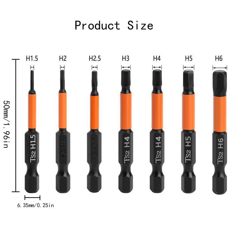 • 【Set Includes】7 pieces metric hex drill bits: H1.5/H2/H2.5/H3/H4/H5/H6 to meet your different needs. Shank: 1/4" hex shank; Length: 50mm