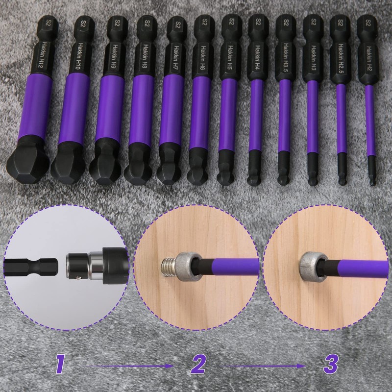 Allen Key Bit Set Hakkin 12Pcs Ball End Allen Hex Key Set S2 Steel 1/4” Hex Shank Magnetic Allen Wrench Screwdriver Bits 65mm Phosphating Treatment Purple H2-H12 for Assembling Furniture