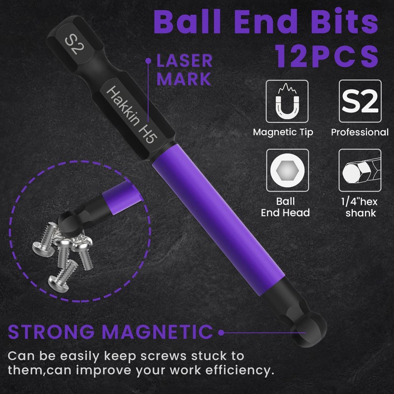 - 【Premium S2 Steel】Hakkin Ball End Hex Bits are made of high quality S2 Steel, high hardness, wear resistance. The surface adopts phosphating process, durable for long time service. Heat treated for durability, hardness reaches 65RCH.