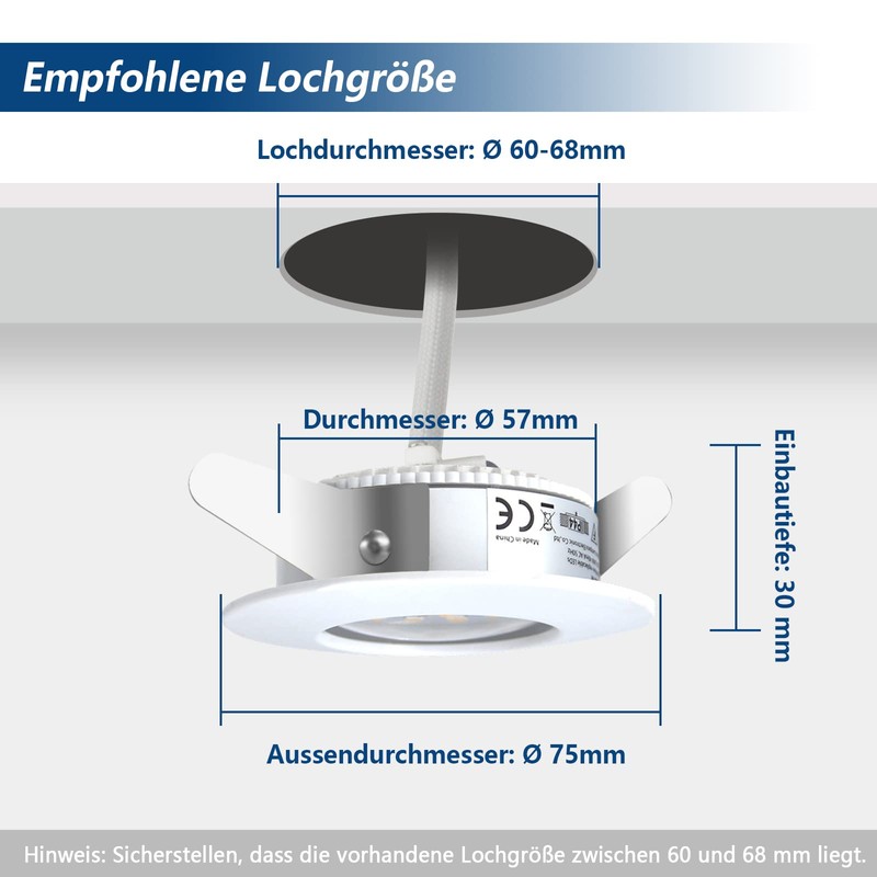 - Ultra-thin integrated design: LED recessed light with a thickness of only 30 mm, a diameter of 75 mm, an opening diameter of 68 mm and a installation depth of 30 mm.
