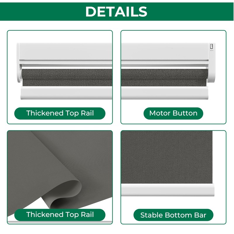 - MATERIAL & BASIC PROPERTIES: Motorized roller blinds are thickened and encrypted, durable, fade-resistant, anti-warping, anti-scratch, moisture-proof, waterproof, heat-insulating, flame-retardant, oil-resistant, easy to use, clean and not easy to discolor. Suitable for office, workshop, business area, bedroom, living room, kitchen, reduce noise and Insulation