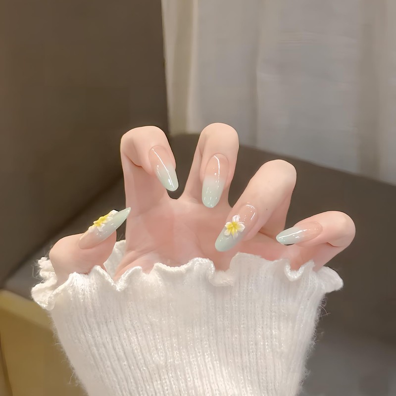 [ALLEVG]ネイルチップ 30枚入 ミントリーフ×ハワイアンフラワー3D彫刻付け爪 〜涼やかで優しい清楚系デザイン 春夏 ミディアム 人気 和風 かわいい シンプル おしゃれ 成人式 入学式 卒業式 結婚式 パーティー 花嫁ネイル