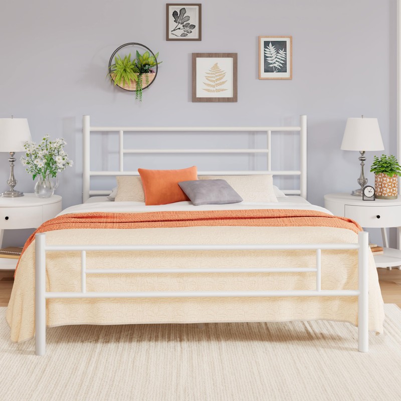 - Modern and Minimalistic: Designed with a simplistic headboard and footboard, this metal bed frame complements any contemporary or minimalist bedroom style. With durable metal slats, this platform bed eliminates the need for a box spring, helping extend mattress life while maintaining a low-profile, minimalist aesthetic