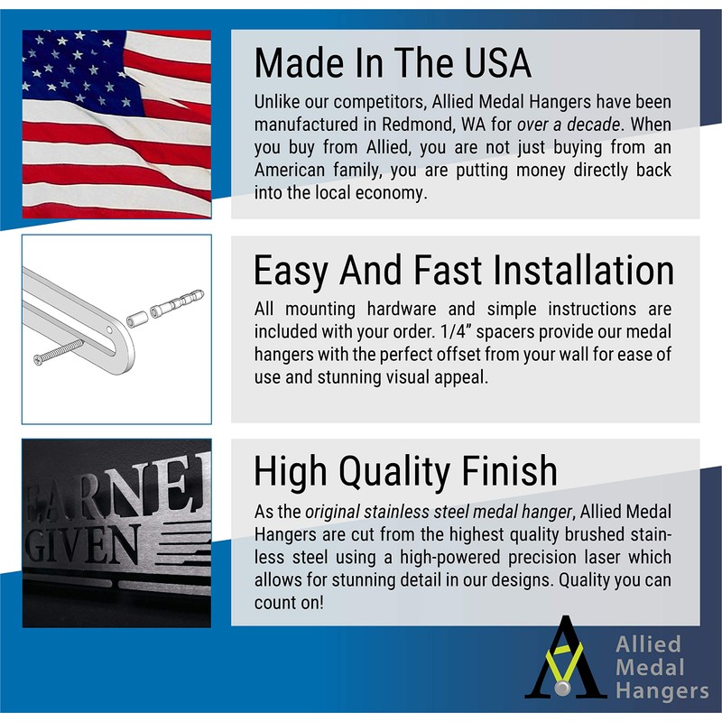 - MADE IN THE USA - Unlike similar competitors, all of our medal hangers are designed, cut, grained and packaged in our shop in Redmond, Washington. Allied is a family-owned and operated business. We take our quality, production and products seriously. We value our neighbors, and work diligently to keep our business locally sourced and operated. When you are buying from Allied Medal Hangers, you are not just buying from a family, you are putting money directly back into the local economy.