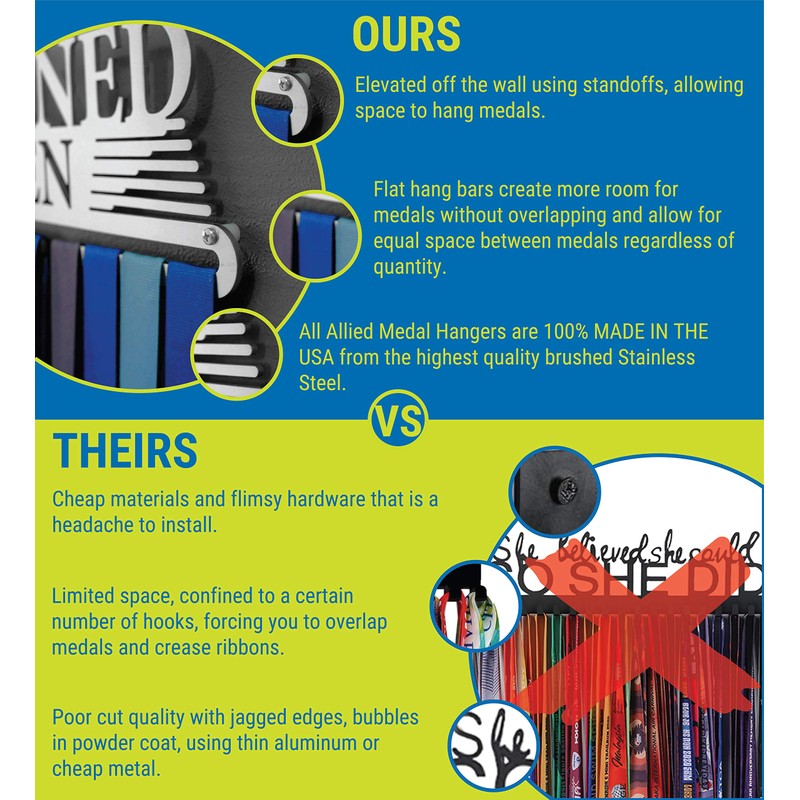 - HIGH QUALITY FINISH – Allied Medal Hangers are cut from the highest quality brushed stainless steel using a high-powered precision laser which allows us to achieve stunning detail in our designs. We’ve been selling our medal hangers since 2009 and have received thousands of compliments from customers just like you who are thrilled their hanger has withstood the test of time and the weight of MANY medals. The cost of our hangers comes directly from the quality of our products!