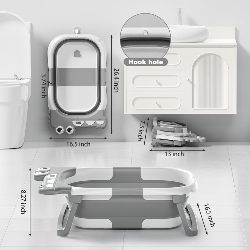 Collapsible Baby Bathtub for Newborn, Foldable Baby Bath Tub with Thermometer & Soft Floating Cushion & Drain Hole, Portable Travel Infant Bath Tubs for Newborns to Toddlers 0-36 Months Boys, Grey