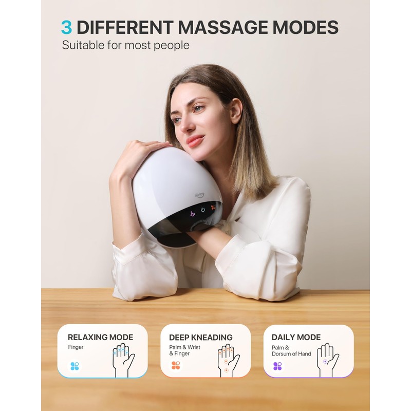 - Soothing Heat Therapy: Heat hand massager features three levels of heat therapy 35℃-45℃ to promote blood circulation and relax tight muscles; Heat therapy helps to soothe soreness and stiffness in your hands, providing a warm and comforting sensation