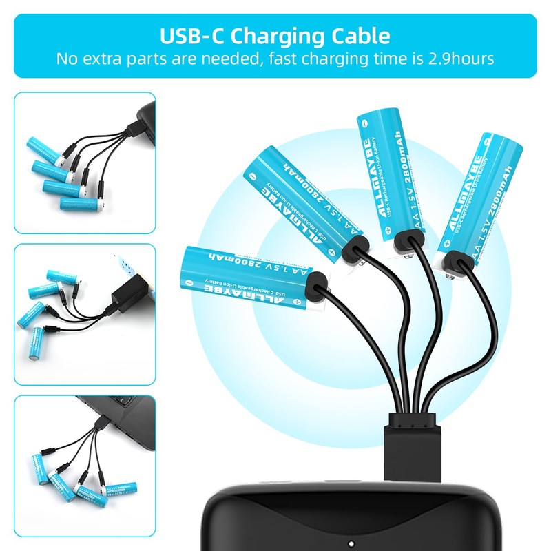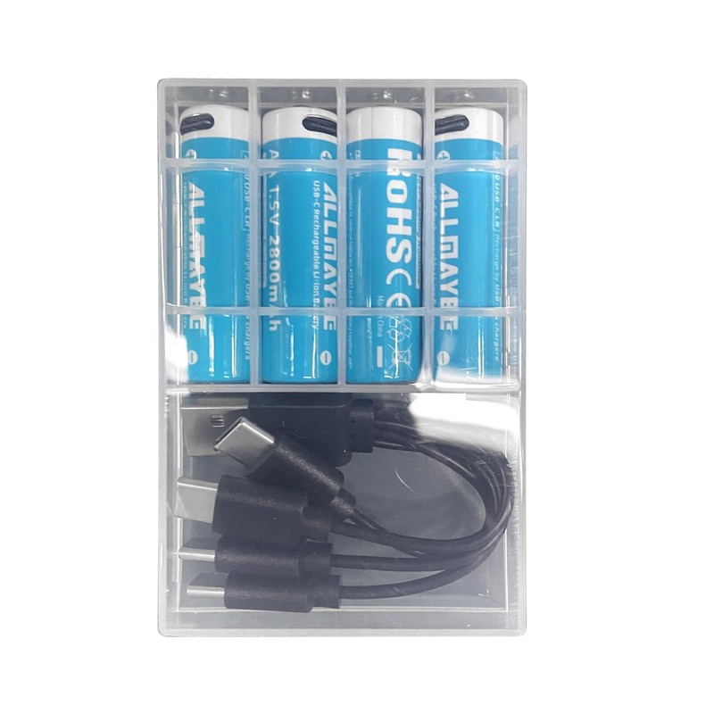 - Package List: 8pcs 1.5V 2800mAh AA Batteries + 2 Battery Cases + 1 Charging Cable (single cable, charges up to 4 devices together)