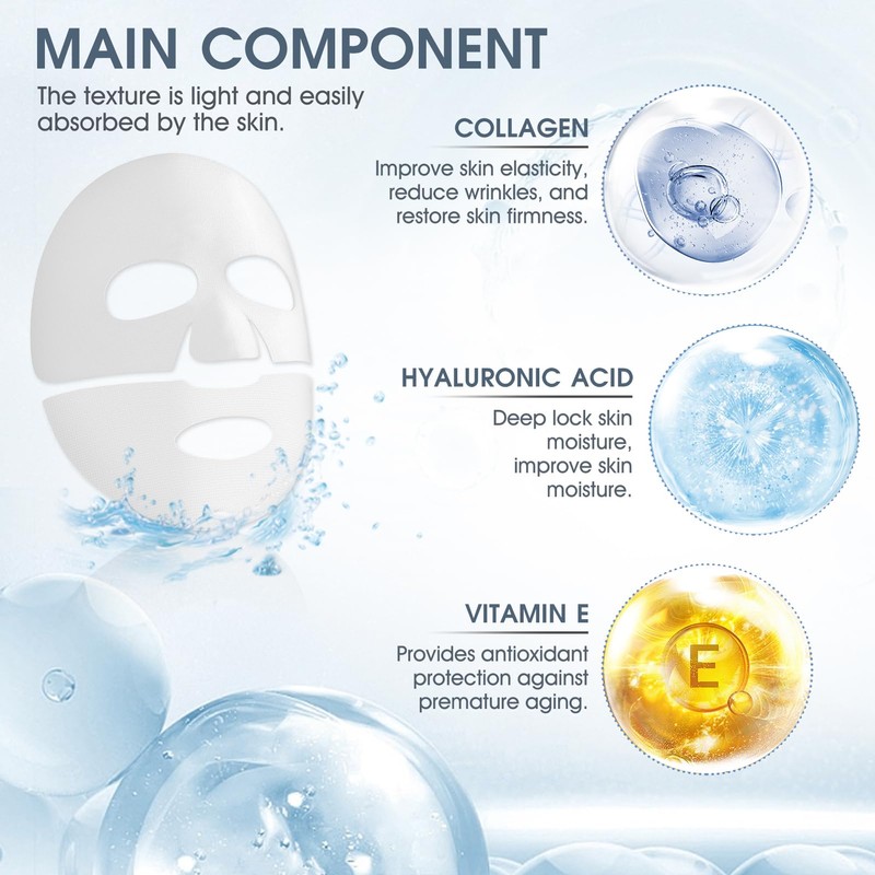 • [kollagen maske]: Kollagen ist eines der wichtigsten Proteine ​​der Haut und spielt eine Schlüsselrolle bei der Aufrechterhaltung der Hautelastizität. Mit zunehmendem Alter entwickelt unsere Haut schlaffe, feine Linien und Fältchen. Eine Kollagenergänzung kann helfen, diese Symptome zu lindern.