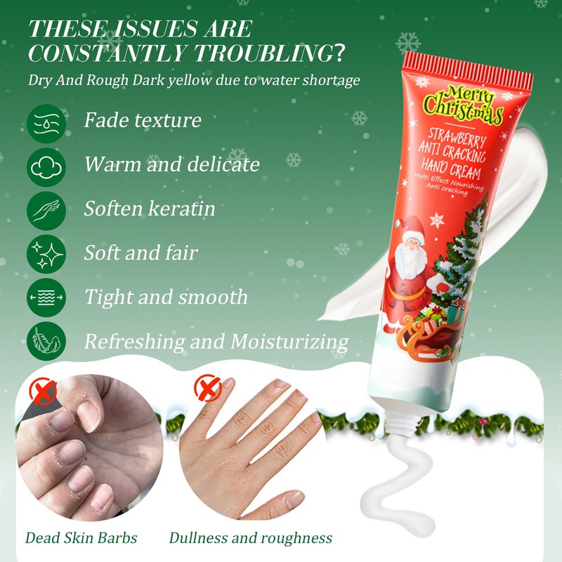 - [Christmas hand cream]: moisturising and nourishing, works against dehydration and ageing, helps reduce dry lines and fine lines on the hands, improves dryness, rough skin and other problems, and makes hands soft and smooth. Give your fingertips an elegant fragrance and delight body and mind.