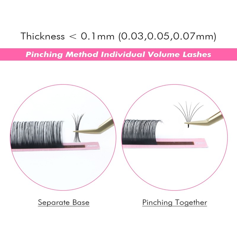 - PRODUCT FEATURES These are individual eyelash extensions for classic or voluminous hand application. They are not simple compartments. This eyelash extension has a separate base and there is no glue at the bottom of the eyelashes. They are easy to make fans with the pinching method (0.03/0.05/0.07 mm).