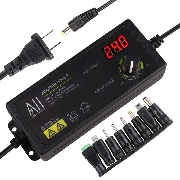 AlloverPower 3V - 24V 1.5A 36W Universal Adjustable DC Power Supply Kit AC Adapter Speed Control Volt Display ON Off Switch with Variable 8 Plugs