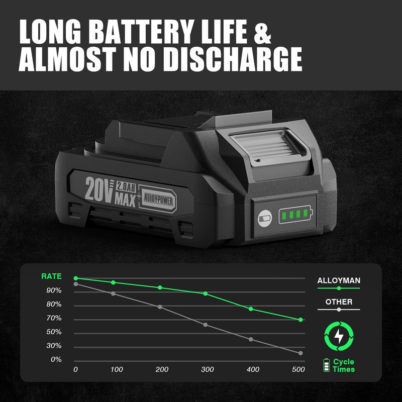 - 【High performance & large capacity battery】20V Alloypower Battery Pack With a remarkable 2000MAH capacity, this lithium-ion battery provides extended usage times, making it better for demanding applications without frequent recharges.