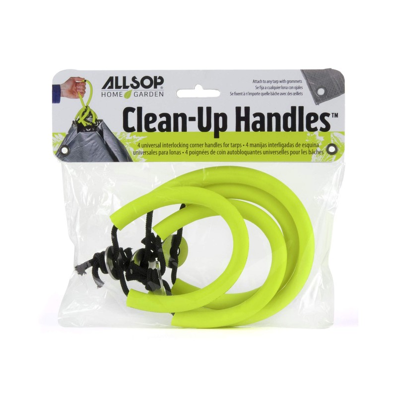 Turn any standard riveted tarp into a multi-functional cover or bag by attaching four universal interlocking Clean-Up Handles. These four reinforced soft grip interlocking rubber handles make yard clean up a cinch! Just load the tarp with clippings, leaves, or debris; interlock the four soft grip handles; and easily haul the tarp without a mess!