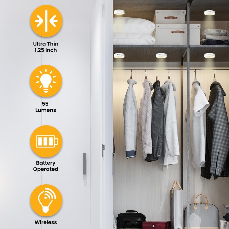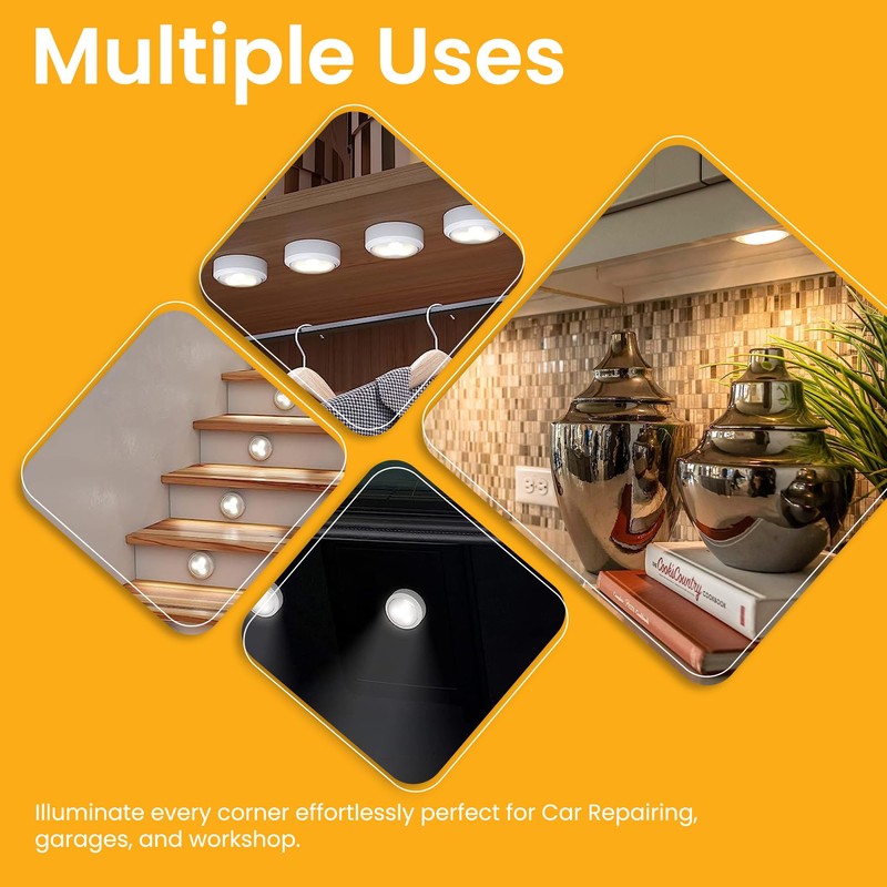 - 𝗟𝗢𝗡𝗚𝗘𝗥 𝗕𝗔𝗧𝗧𝗘𝗥𝗬 𝗟𝗜𝗙𝗘: Tired of constantly changing batteries in your puck lights? LED Puck Lights have your solution! Lasting 4 times longer than other puck lights, these under cabinet lights operate on just 3 AA batteries (included). With cabinet lights, your batteries go the extra mile, making them a convenient and cost-effective lighting solution.