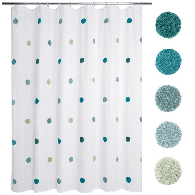 Allure Home Creation Dots Fabric Shower Curtain Pom Poms on White (Teal) 70"x72"