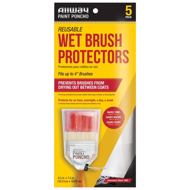 Need to take a break from your painting project? The Allway Tools Paint Ponchos have you covered. These handy plastic protectors fit over your brushes and keeps them protected for weeks. The Paint Ponchos fit 1" to 4" brushes, so there is no need to buy different sizes to protect your favorite painting tools. The Paint Ponchos are made from EVA plastic for greater durability and feature an elastic pull cord and spring lock closure system to allow for easy use and reuse. The frosted appearance even becomes clearer when wet, visually showing the protection. The innovative shape of the protectors provides a wide opening for easy placement of painting tools with less mess. The Paint Ponchos can be used with paint, stain, polyurethane, and other liquids. Includes 5 reusable/disposable wet brush protectors. Keep your brushes wet and fresh in between coats. Never worry about cleaning your brushes when you need to take a break again! Save paint. Save water. Save time!