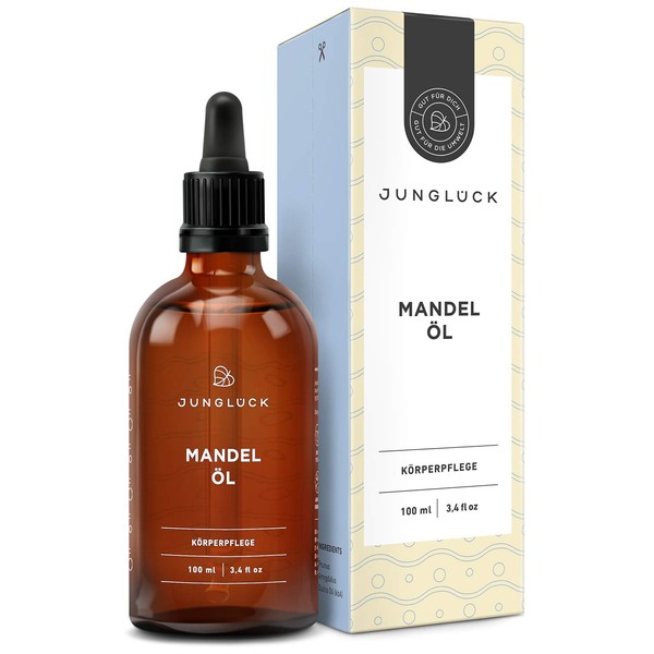Junglück Vegan Almond Oil in Brown Glass - Moisturiser and Anti-Ageing for Face and Skin thanks to Pure Oil from Cores of Almond - Natural Cosmetics Made in Germany - 100 ml