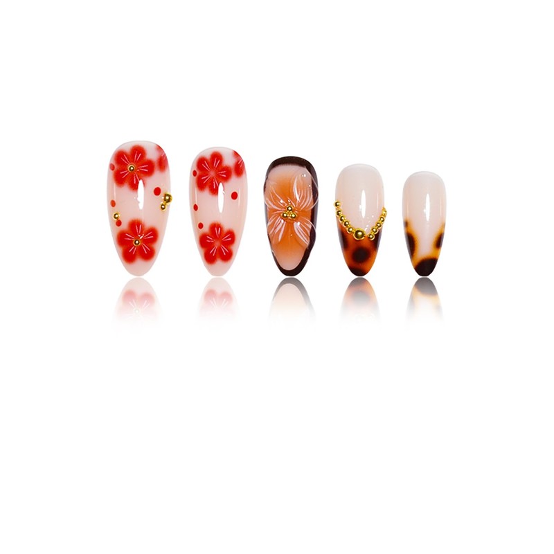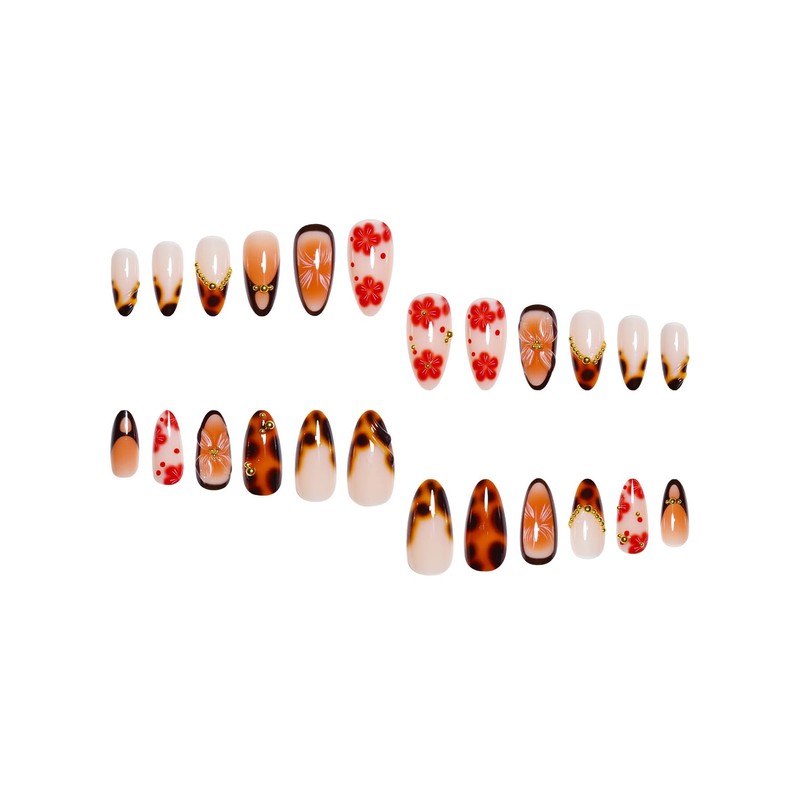 Almond Press on Nails Long Fake Nails French False Nails Brown Artificial Nails with Tortoiseshell and Gold Charm Designs Summer and Fall Nails Cute Acrylic Nails Press ons Red Flowers Handmade Nails