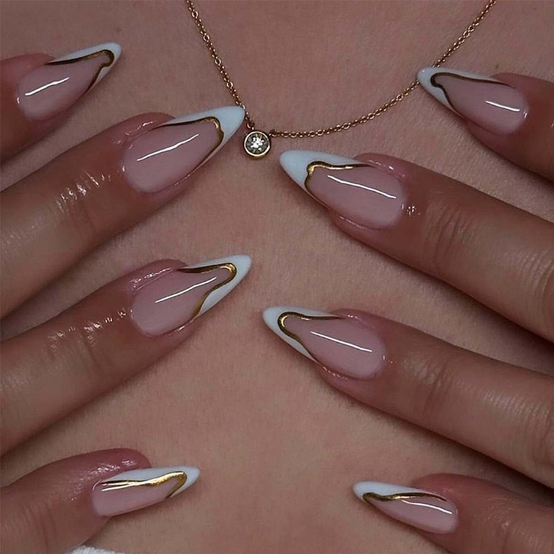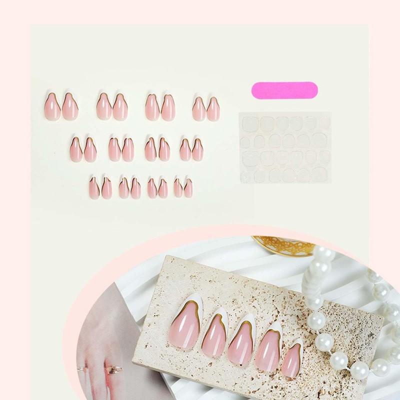 Almond Press On Nails Medium Fake Nails French Tip False Nails With Gold Line Design Glue On Nails Reusable Artificial Acrylic Full Cover Stick On Nails For Women Manicure 24pcs
