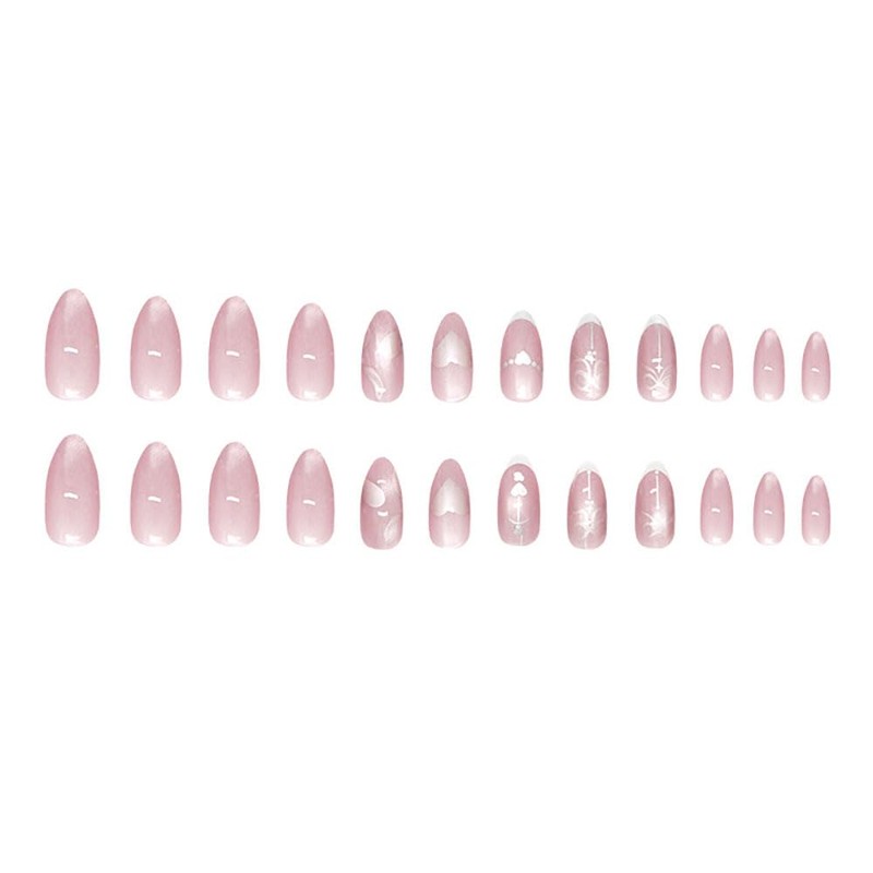 24 pcs fake nails (12 sizes) 24 pcs of jelly glue 1 pcs nail file 1 pcs wooden remover stick 1 pcs alcohol cotton