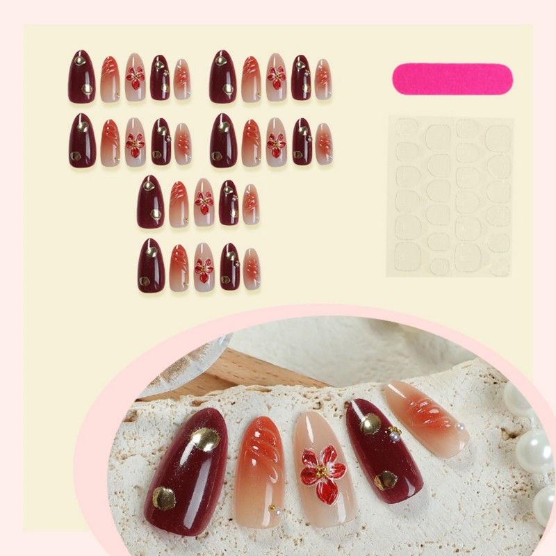 Almond Press on Nails Medium Fake Nails Red Artificial Nail with Flowers Designs Stick on Nail 24pcs