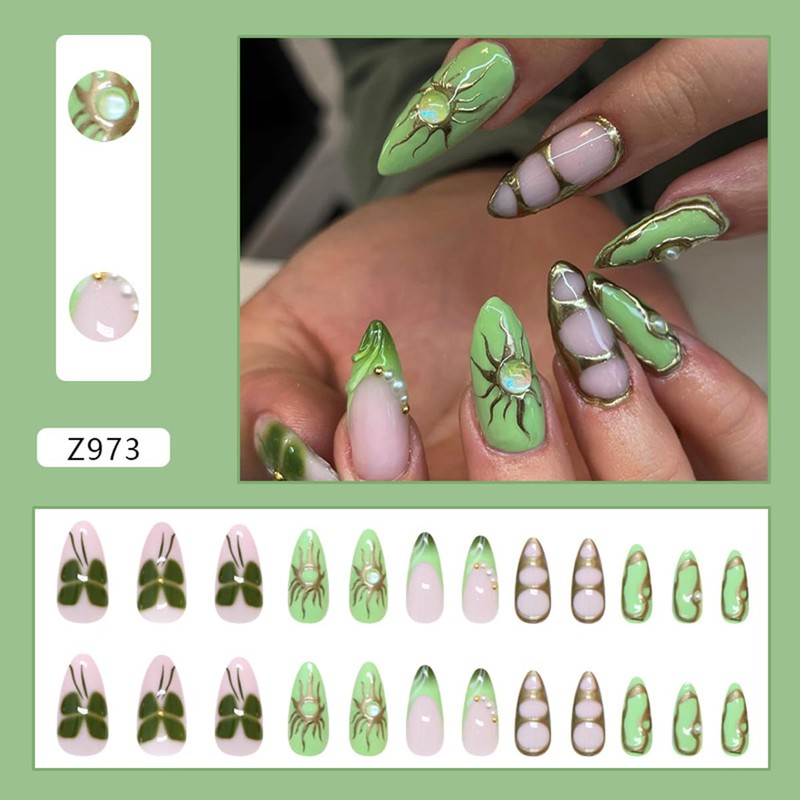 Almond Press on Nails Medium Fake Nails with Gem Pearls Green Acrylic Full Cover with Butterfly Print Golden Circle Stripe Designs Glue on Nails Stiletto Nails Reusable Stick on Nails for Women 24PCS