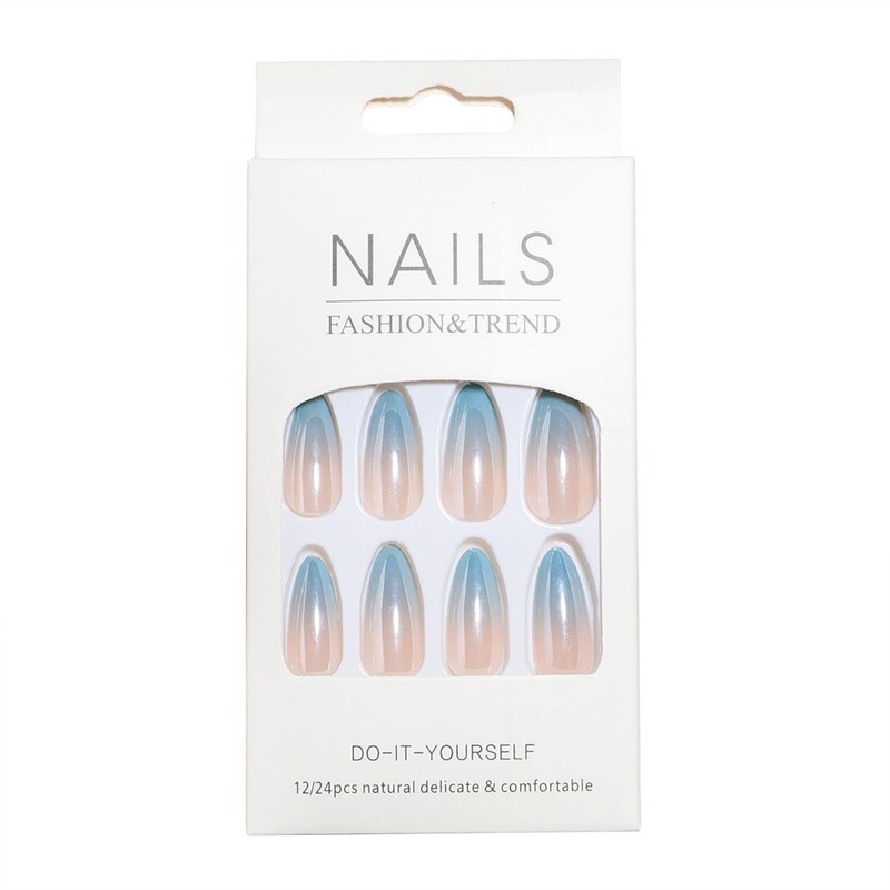 Almond Press on Nails with Glazed Gradient Lake Blue Designs Fake Nails Medium Almond Shaped Acrylic Nails Glossy False Nails Reusable Glue on Nails for Women Girls 24 Pcs