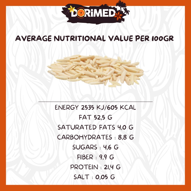 - Laminated almond in sticks: the almond is a dried fruit of the highest quality. Oval shape, brown colour, very thin skin and white flesh with pleasant taste. Cut into small raw almond sticks. This 1 kg pack is perfect and the almonds are already prepared and peeled without peel and in the form of fine sticks.