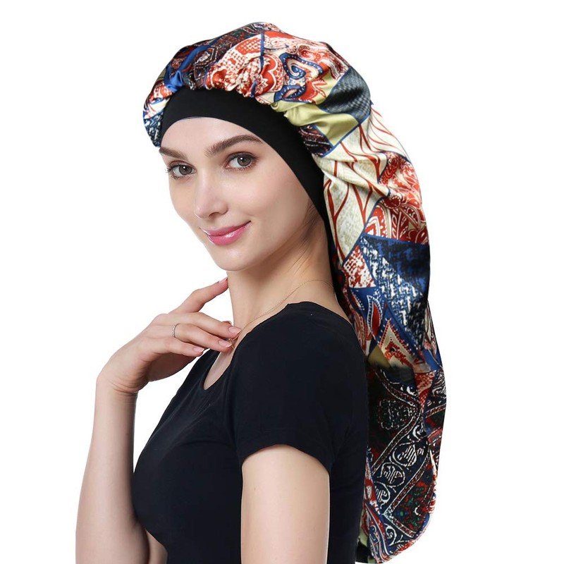 Alnorm Long Satin Bonnet Sleep Cap - Double Layer Soft Elastic Band, African print, Einheitsgröße